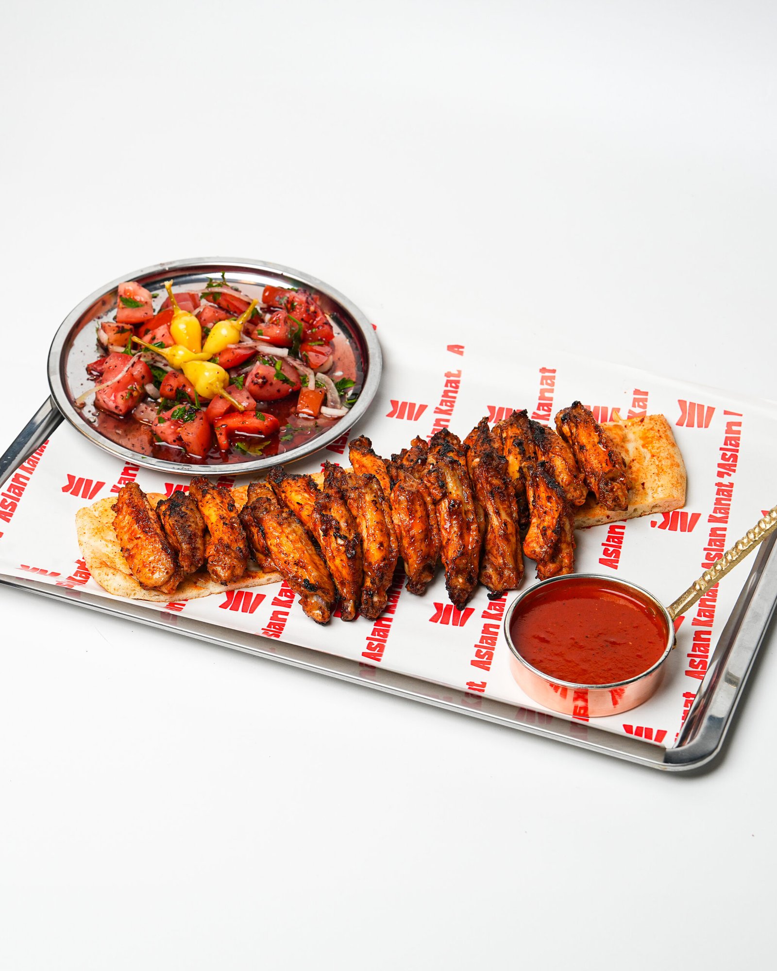 1,5 porsiyon yaprak kanat yanında tablacı salatası, baharatlı patates ve özel acı sos ile